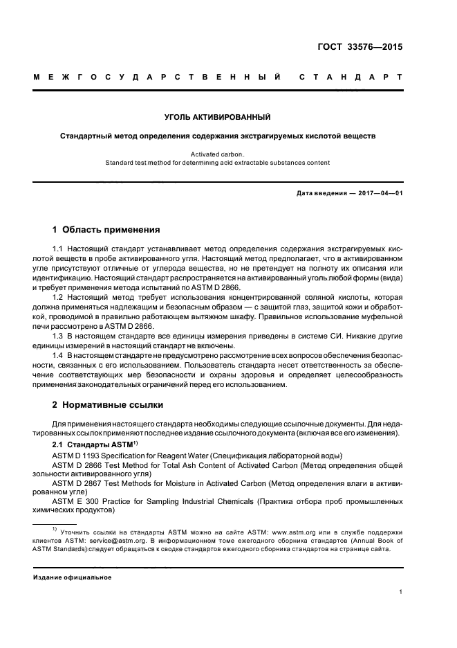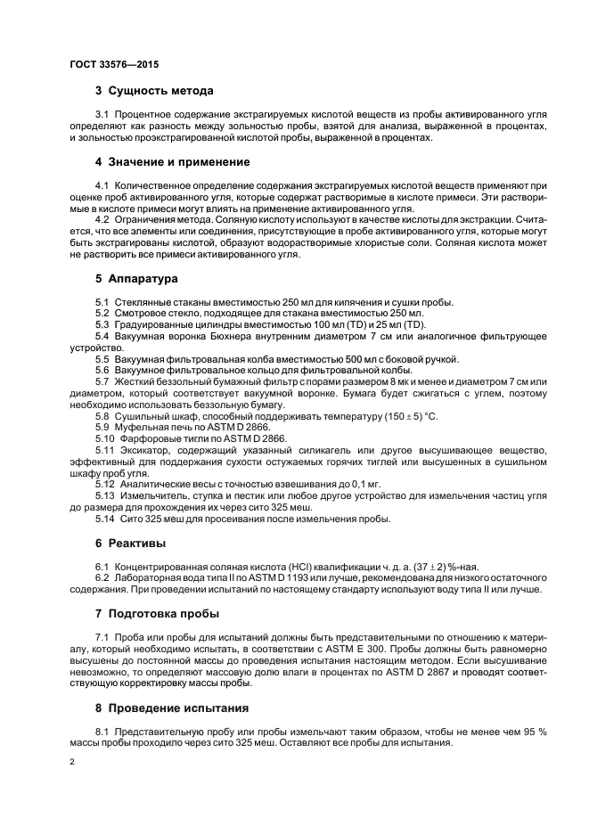 Настоящий стандарт устанавливает метод определения содержания экстрагируемых кислотой веществ в пробе активированного угля. Настоящий метод предполагает, что в активированном угле присутствуют отличные от углерода вещества, но не претендует на полноту их описания или идентификацию. Настоящий стандарт распространяется на активированный уголь любой формы (вида) и требует применения метода испытаний по ASTM D 2866.