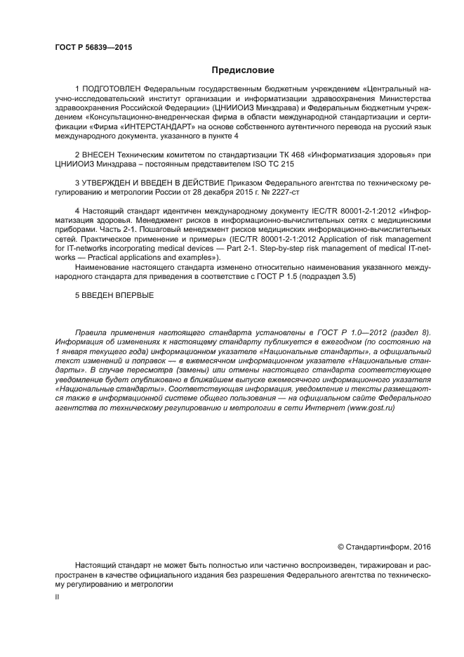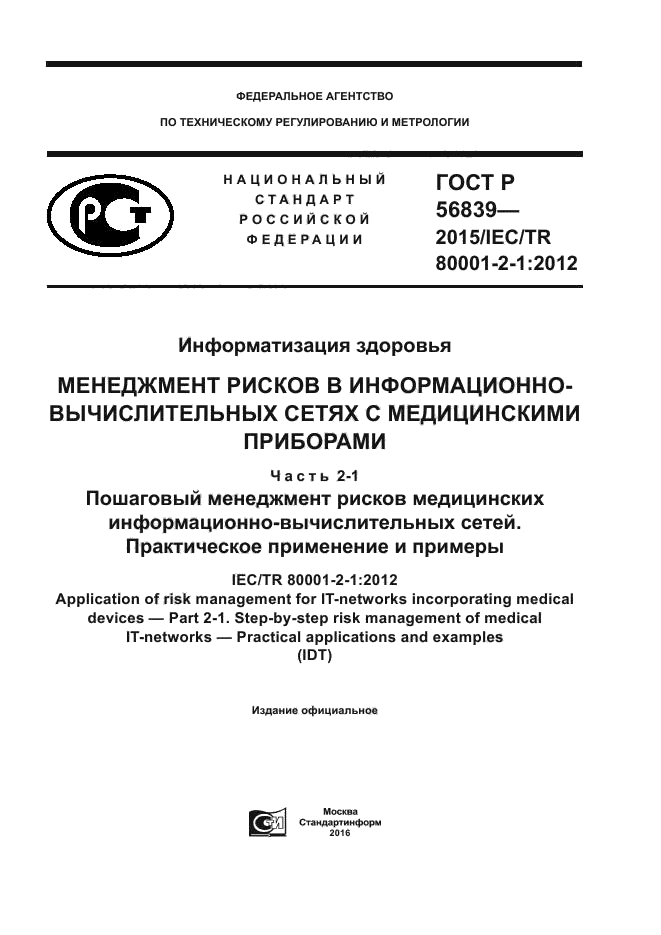 | Название рус.: | Информатизация здоровья. Менеджмент рисков в информационно-вычислительных сетях с медицинскими приборами. Часть 2-1. Пошаговый менеджмент рисков медицинских информационно-вычислительных сетей. Практическое применение и примеры |