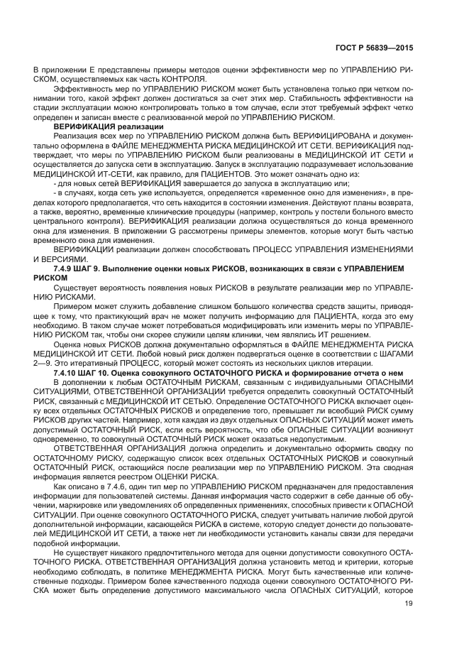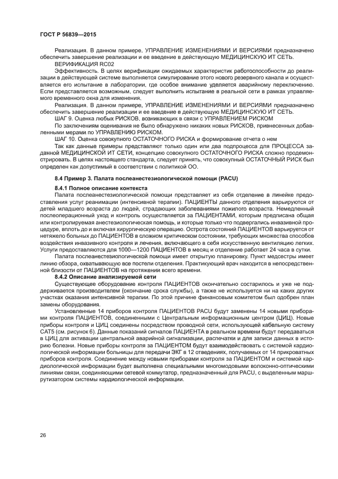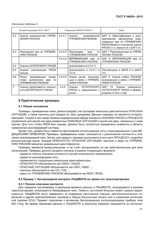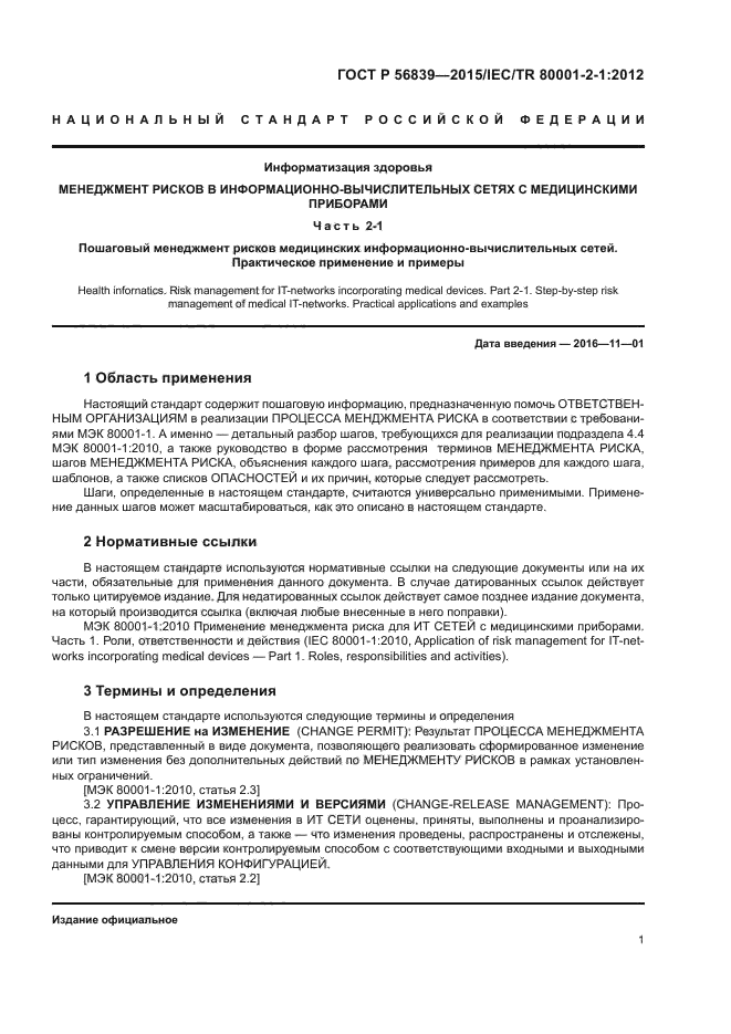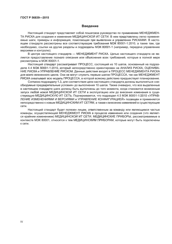Настоящий стандарт содержит пошаговую информацию, предназначенную помочь ОТВЕТСТВЕННЫМ ОРГАНИЗАЦИЯМ в реализации ПРОЦЕССА МЕНДЖМЕНТА РИСКА в соответствии с требованиями МЭК 80001-1. А именно детальный разбор шагов, требующихся для реализации подраздела 4.4 стандарта МЭК 80001-1:2010, а также руководство в форме рассмотрения терминов МЕНЕДЖМЕНТА РИСКА, шагов МЕНЕДЖМЕНТА РИСКА, объяснения каждого шага, рассмотрения примеров для каждого шага, шаблонов, а также списков ОПАСНОСТЕЙ и их причин, которые следует рассмотреть