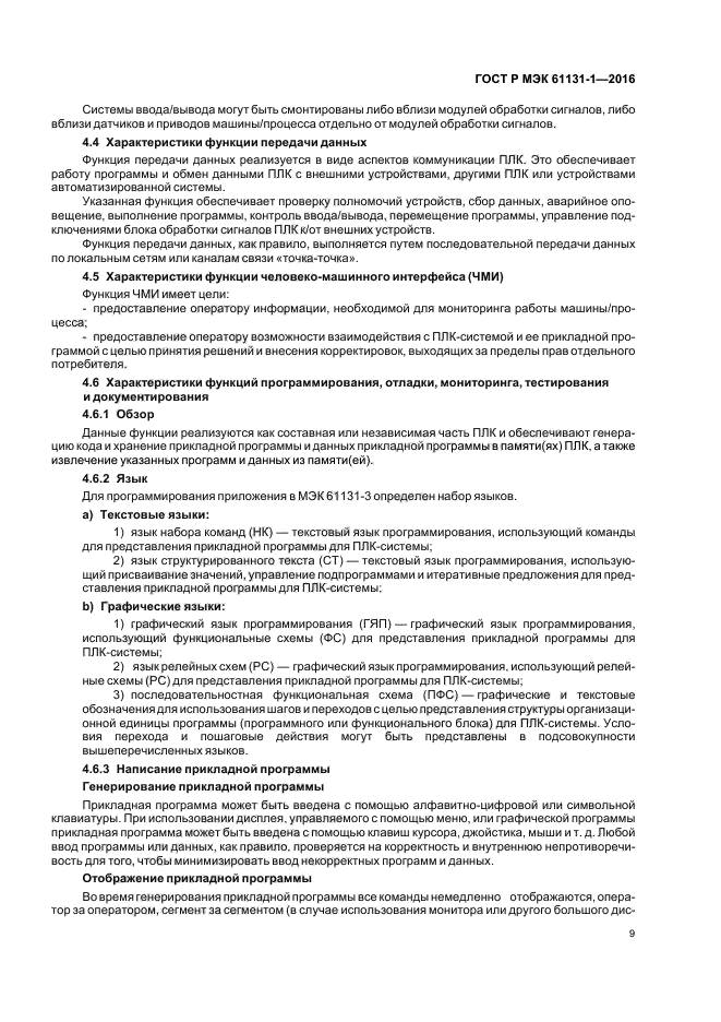 | Область и условия применения: | Настоящий стандарт распространяется на программируемые (логические) контроллеры (ПЛК) и связанные с ними периферийные устройства, например, инструментальные средства программирования и отладки (СПиО), человеко-машинные интерфейсы (ЧМИ) и т. д., предназначенные для контроля и управления машинами и производственными процессами |