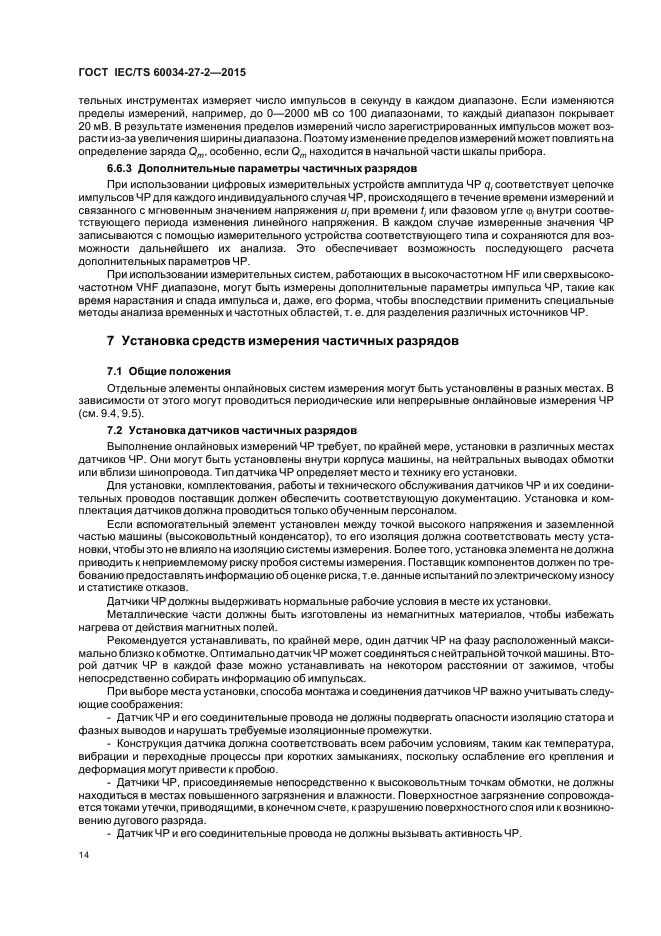 Настоящий стандарт устанавливает требования к измерениям частичного разряда (далее - ЧР) на изоляции статорных обмоток включенных в сеть вращающихся электрических машин с номинальным напряжением 3 кВ и выше, кроме питающихся от преобразователей частоты. Настоящий стандарт распространяется на измерительные системы ЧР и методы определения электрических сигналов, вызванных ими. Для определения наличия электрического искрения и дуги могут использоваться те же измерительные устройства и процедуры
