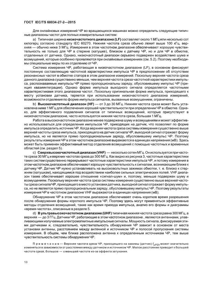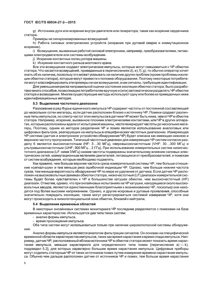 - измерительной техники и оборудования, - установки оборудования, - стандартизации и процедуры испытаний, - последовательности измерений, - снижения шума, - оформления результатов, - интерпретации результатов. Настоящий стандарт устанавливает требования к измерениям частичного разряда (далее - ЧР) на изоляции статорных обмоток включенных в сеть вращающихся электрических машин с номинальным напряжением 3 кВ и выше, кроме питающихся от преобразователей частоты. Настоящий стандарт распространяется на измерительные системы ЧР и методы определения электрических сигналов, вызванных ими. Для определения наличия электрического искрения и дуги могут использоваться те же измерительные устройства и процедуры |