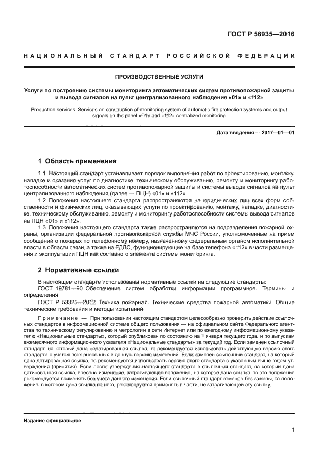 Положения настоящего стандарта распространяются на юридических лиц всех форм собственности и физических лиц, оказывающих услуги по проектированию, монтажу, наладке, диагностике, техническому обслуживанию, ремонту и мониторингу работоспособности системы вывода сигналов на ПЦН «01» и «112».