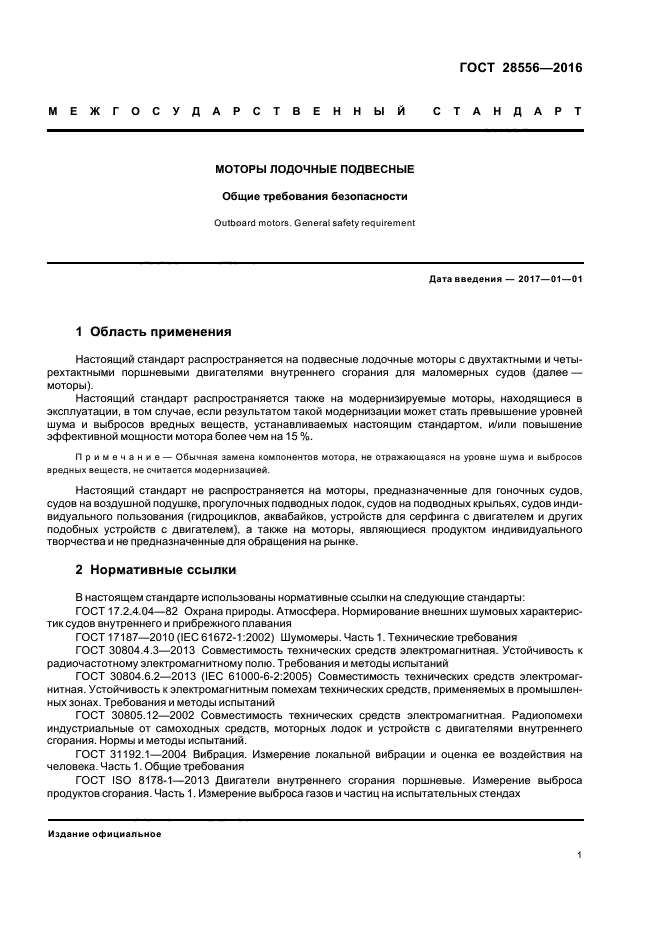 | Область и условия применения: | Настоящий стандарт распространяется на подвесные лодочные моторы с двухтактными и четырехтактными поршневыми двигателями внутреннего сгорания для маломерных судов (далее - моторы) |