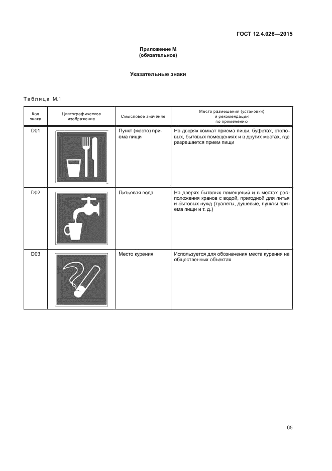 Стандарт разработан в целях предотвращения несчастных случаев, снижения травматизма и профессиональных заболеваний, устранения опасности для жизни, вреда для здоровья людей, опасности возникновения пожаров или аварий. Стандарт не распространяется: - на цвета, применяемые для световой сигнализации всех видов транспорта, транспортных средств и дорожного движения; - цвета, знаки и маркировочные щитки баллонов, трубопроводов, емкостей для хранения и транспортирования газов и жидкостей; - дорожные знаки и разметку, путевые и сигнальные знаки железных дорог, знаки для обеспечения безопасности движения всех видов транспорта (кроме знаков безопасности для подъемно-транспортных механизмов, внутризаводского, пассажирского и общественного транспорта); - знаки и маркировку опасных грузов, грузовых единиц, требующих специальных условий транспортирования и хранения; - знаки для электротехники. Стандарт устанавливает: - назначение, правила применения и характеристики сигнальных цветов; - назначение, правила применения, виды и исполнения, цветографическое изображение, размеры, технические требования и характеристики, методы испытаний знаков безопасности; - назначение, правила применения, виды и исполнения, цветографическое изображение, размеры, технические требования и характеристики, методы испытаний сигнальной разметки |