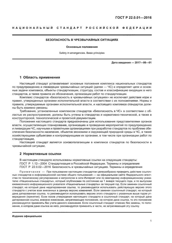 Комплекс стандартов «Безопасность в чрезвычайных ситуациях» не исключает действия норм и правил, утвержденных органами исполнительной власти в соответствии с их полномочиями. Нормы и правила, утверждаемые органами исполнительной власти, и настоящего комплекса стандартов должны быть взаимно увязаны. Требования, установленные комплексом стандартов «Безопасность в ЧС» в соответствии с областью их распространения, должны быть учтены в стандартах и нормативно-технической, а также в конструкторской, технологической и проектной документации. Положения настоящего стандарта предназначены для использования представителями органов власти, осуществляющих планирование, организацию и проведение мероприятий по предупреждению и ликвидации ЧС, научными и проектными организациями при разработке стандартов по проблеме обеспечения безопасности населения, объектов экономики и окружающей природной среды в ЧС, а также хозяйствующими субъектами и контролирующими их органами, в том числе при организации работ по стандартизации. Настоящий стандарт является основополагающим в комплексе стандартов по безопасности в чрезвычайной ситуации |