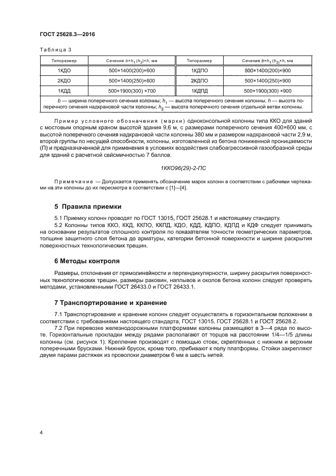 Стандарт устанавливает дополнительные требования к основным размерам и маркировке железобетонных колонн. Основные требования по изготовлению, маркировке, приемке, транспортированию и хранению железобетонных колонн приведены в ГОСТ 25628.1.