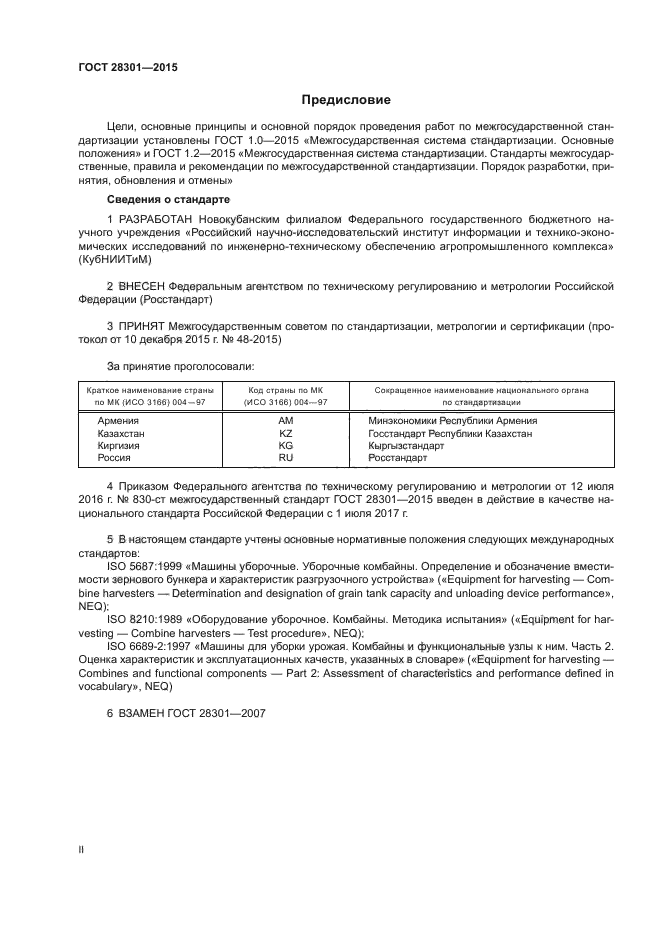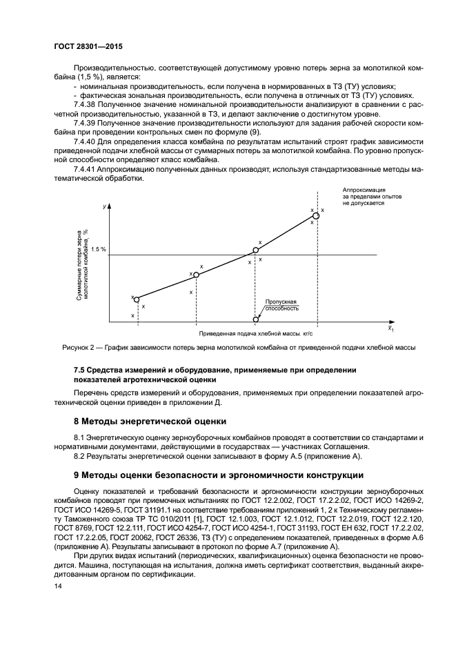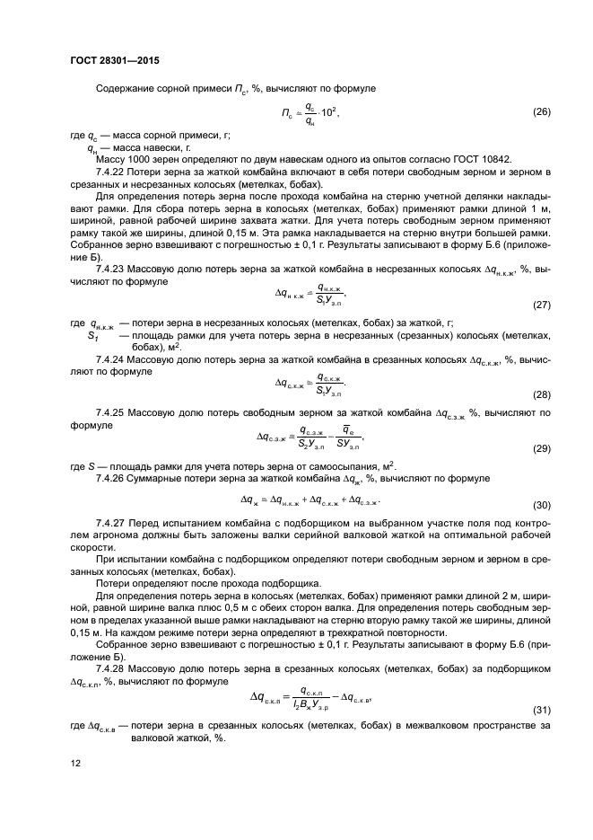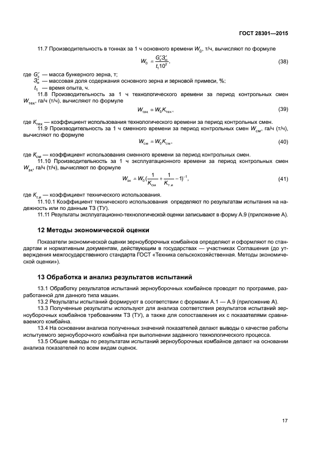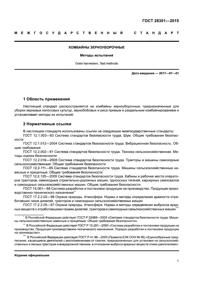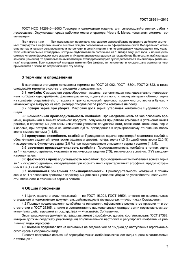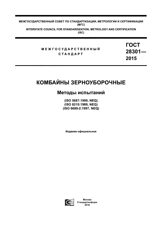 | Область и условия применения: | Настоящий стандарт распространяется на комбайны зерноуборочные, предназначенные для уборки зерновых колосовых культур, зернобобовых и риса прямым и раздельным комбайнированием и устанавливает методы их испытаний |
