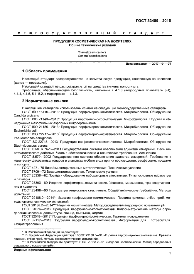 | Область и условия применения: | Настоящий стандарт распространяется на косметическую продукцию, нанесенную на носители |