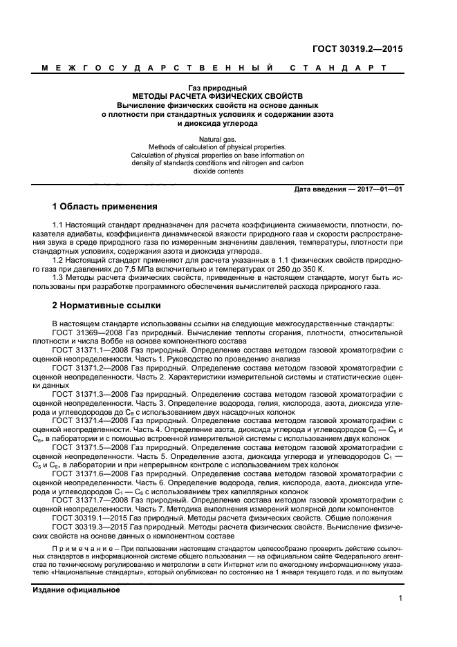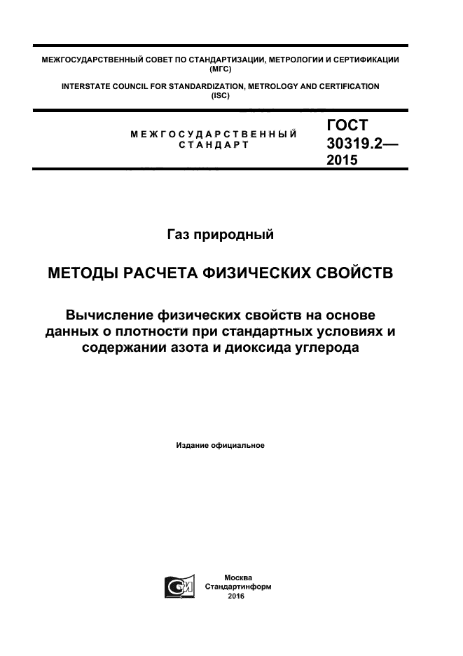 | Название англ.: | Natural gas. Methods of calculation of physical properties. Calculation of physical properties on base information on density of standards conditions and nitrogen and carbon dioxide contents |