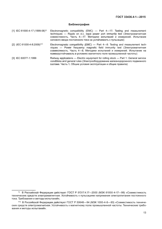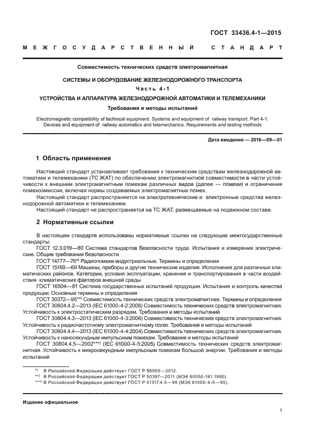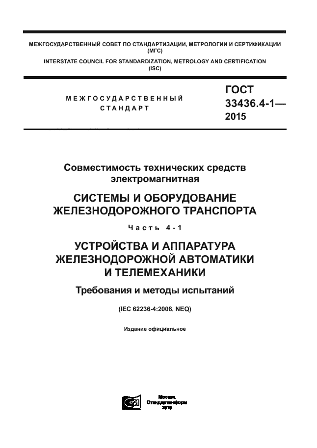 | Название рус.: | Совместимость технических средств электромагнитная. Системы и оборудование железнодорожного транспорта. Часть 4-1. Устройства и аппаратура железнодорожной автоматики и телемеханики. Требования и методы испытаний |