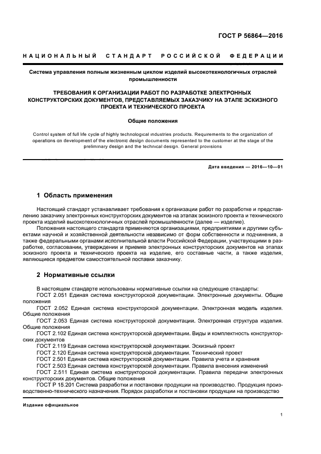 Настоящий стандарт устанавливает требования к организации работ по разработке и представлению заказчику электронных конструкторских документов на этапах эскизного проекта и технического проекта изделий высокотехнологичных отраслей промышленности (далее - изделие)