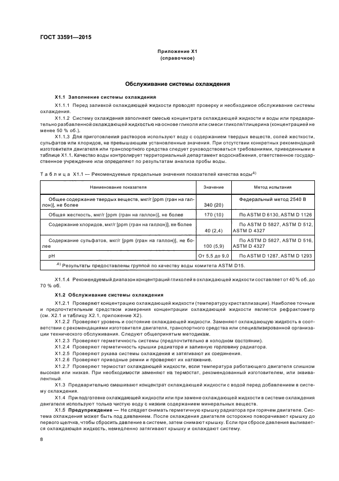 | Область и условия применения: | Настоящий стандарт устанавливает требования к охлаждающим жидкостям на основе этиленгликоля или пропиленгликоля, используемым в системах охлаждения автомобилей или других системах охлаждения с легкими условиями эксплуатации. Использование водных растворов охлаждающих жидкостей концентрацией от 40 % об. до 70 % об. или предварительно разбавленных охлаждающих жидкостей на основе гликоля (концентрацией не менее 50 % об.) без дальнейшего разбавления обеспечивает эффективную защиту от замерзания, закипания и коррозии |