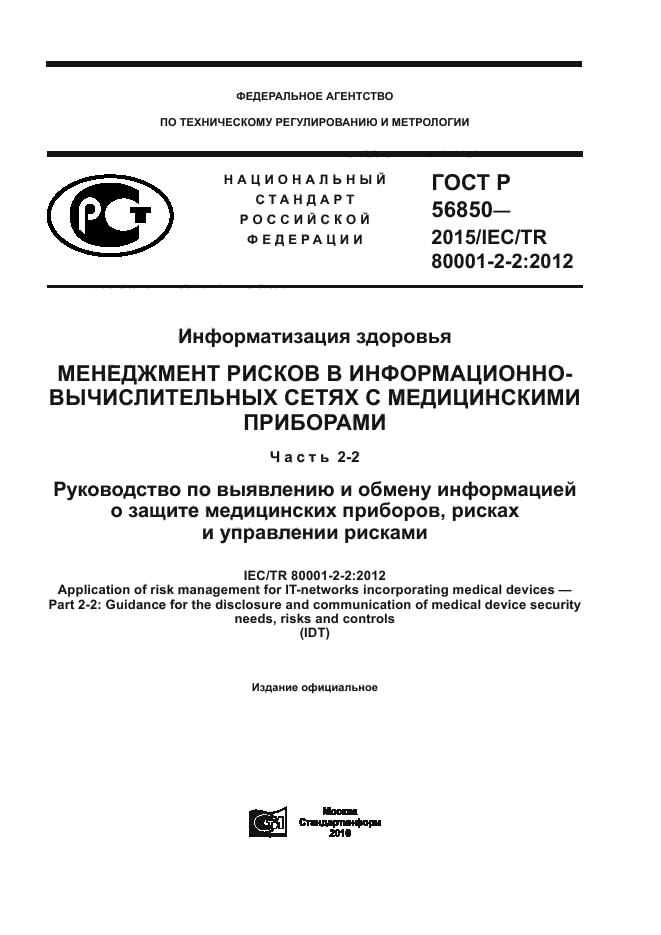 | Название англ.: | Health infornatics. Risk management for IT-networks incorporating medical devices. Part 2-2. Guidance for the disclosure and communication of medical device security needs, risks and controls |