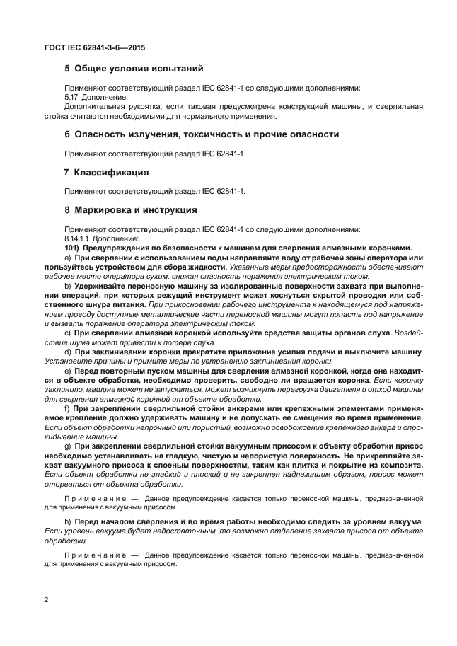Дополнение: Настоящий стандарт устанавливает требования безопасности и методы испытаний электрических переносных машин для сверления алмазными кольцевыми сверлами (алмазными коронками) с присоединением к жидкостной системе. Жидкостная система может использовать жидкость из трубы или емкости |