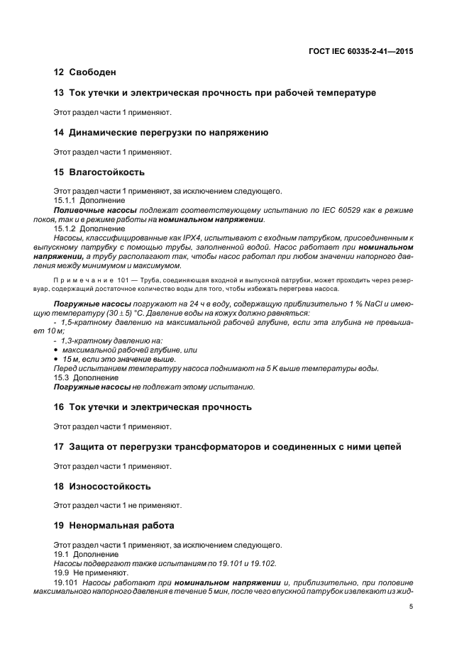 | Область и условия применения: | Настоящий стандарт устанавливает требования безопасности электрических насосов для жидкостей, имеющих температуру не выше 90 °C, бытового и аналогичного применения номинальным напряжением не более: 250 В – для однофазных приборов и 480 В – для других приборов.