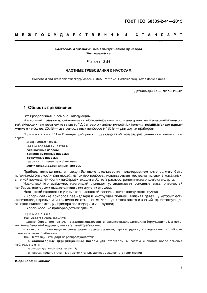 Настоящий стандарт устанавливает требования безопасности электрических насосов для жидкостей, имеющих температуру не выше 90 °C, бытового и аналогичного применения номинальным напряжением не более: 250 В – для однофазных приборов и 480 В – для других приборов.