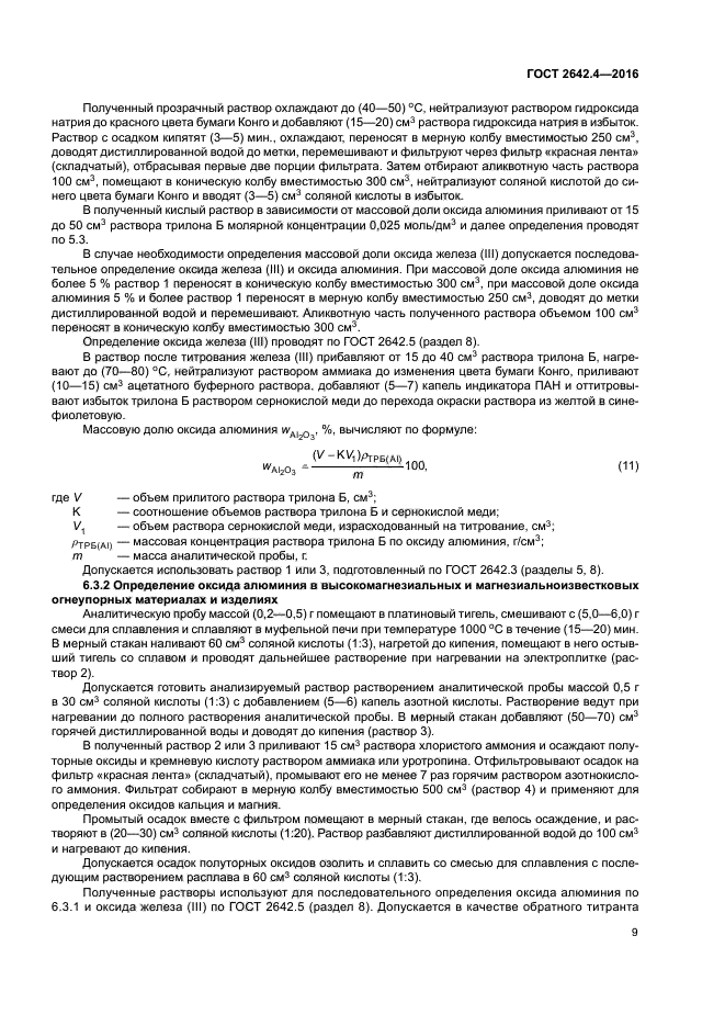 - комплексонометрический метод определения оксида алюминия без отделения оксида кремния (IV) (при массовой доле от 15 % до 99 %); - комплексонометрический метод определения оксида алюминия (при массовой доле от 0,5 % до 70 %); - ускоренный комплексонометрический метод определения оксида алюминия в огнеупорных глинах, каолинах, глиноземистых и алюмосиликатных огнеупорных материалах и изделиях (при массовой доле от 15 % до 99 %); - фотометрический метод определения оксида алюминия в высокомагнезиальных и магнезиальноизвестковых материалах и изделиях (при массовой доле от 0,05 % до 1 %) |