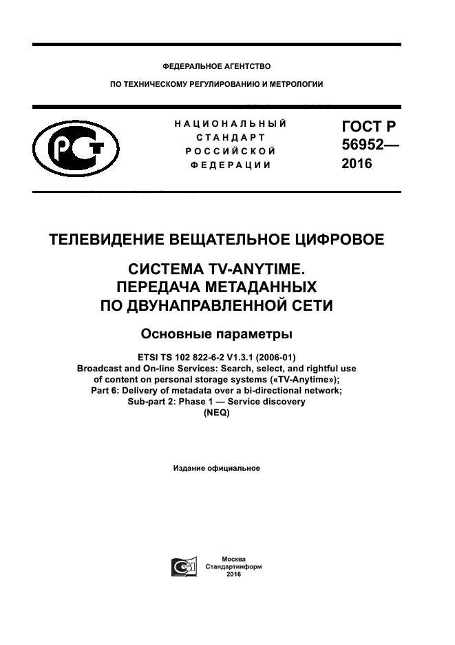 | Название рус.: | Телевидение вещательное цифровое. Система TV-Anytime. Передача метаданных по двунаправленной сети. Основные параметры |