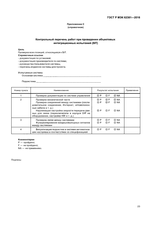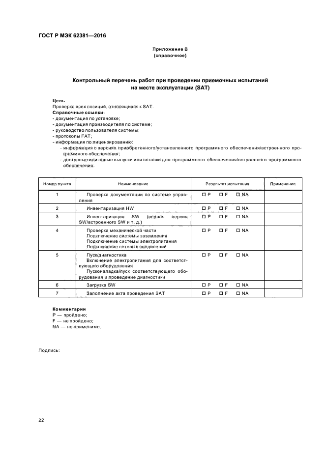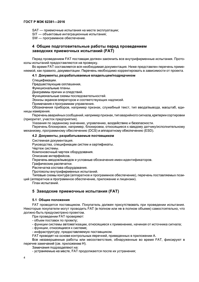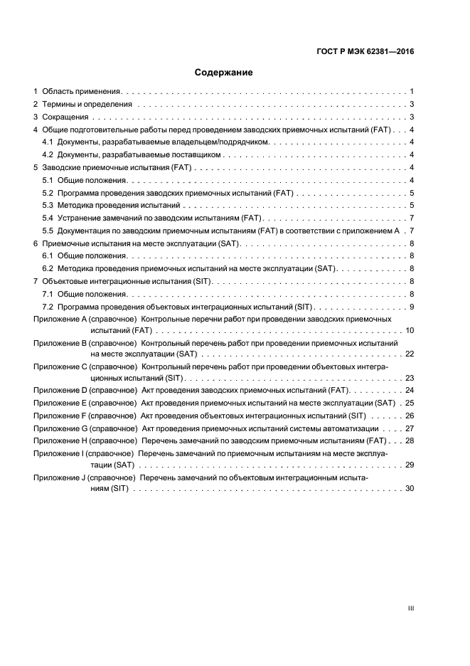 В настоящем стандарте установлены процедуры и требования к заводским приемочным испытаниям (FAT), приемочным испытаниям на месте эксплуатации (SAT) и объектовым интеграционным испытаниям (SIT). Данные испытания проводятся для подтверждения соответствия системы автоматизации соответствующей спецификации