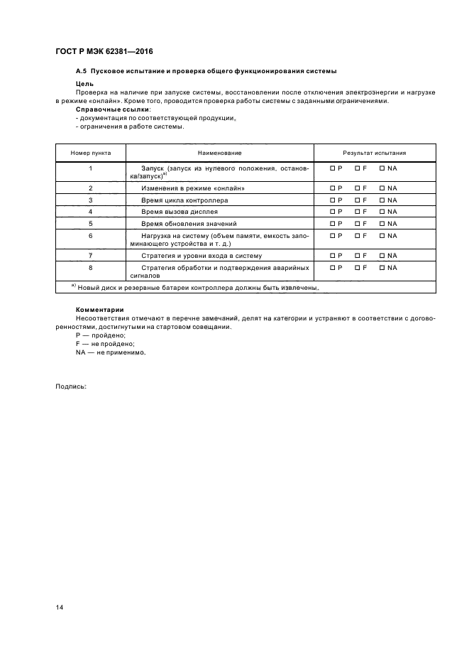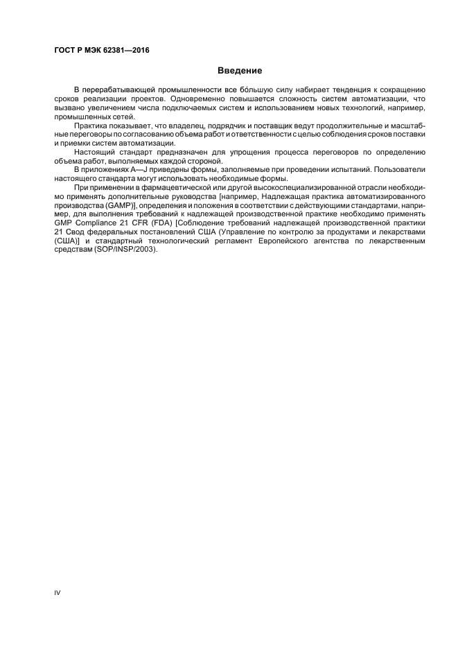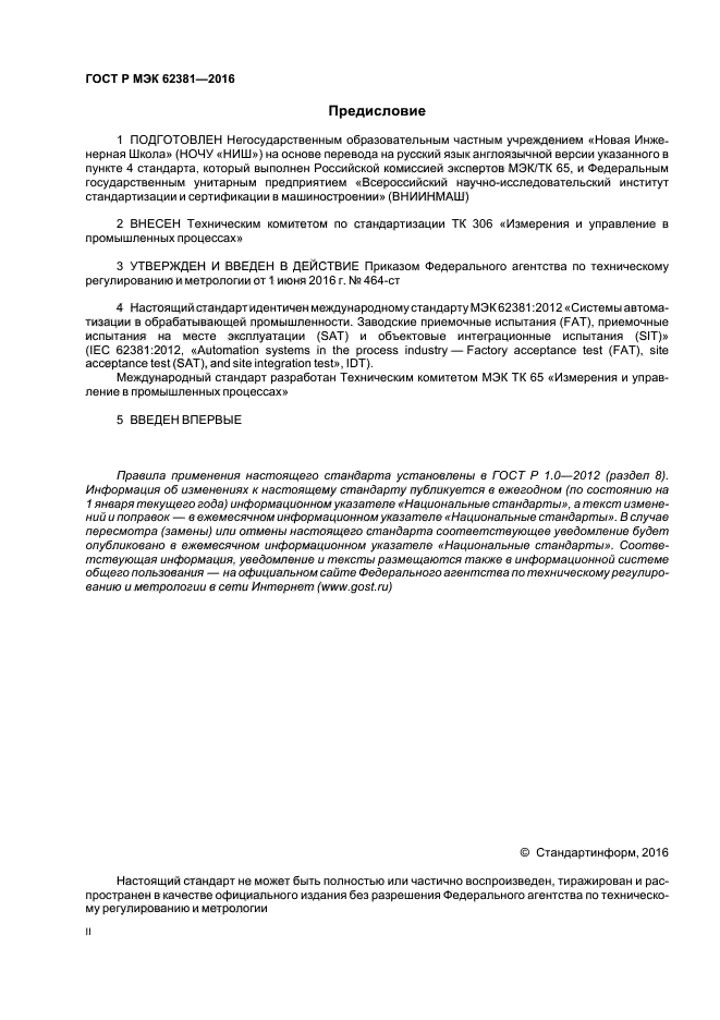 | Область и условия применения: | В настоящем стандарте установлены процедуры и требования к заводским приемочным испытаниям (FAT), приемочным испытаниям на месте эксплуатации (SAT) и объектовым интеграционным испытаниям (SIT). Данные испытания проводятся для подтверждения соответствия системы автоматизации соответствующей спецификации |