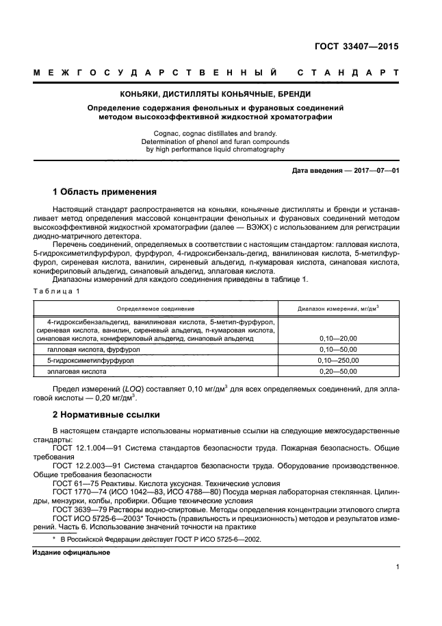 | Название рус.: | Коньяки, дистилляты коньячные, бренди. Определение содержания фенольных и фурановых соединений методом высокоэффективной жидкостной хроматографии |