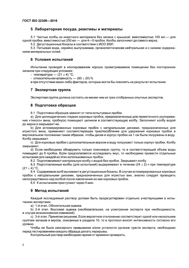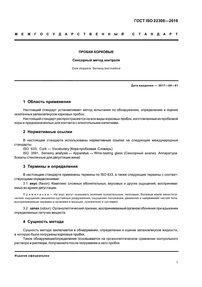 | Область и условия применения: | Настоящий стандарт устанавливает метод испытания по обнаружению, определению и оценке экзогенных запахов/вкусов корковых пробок.