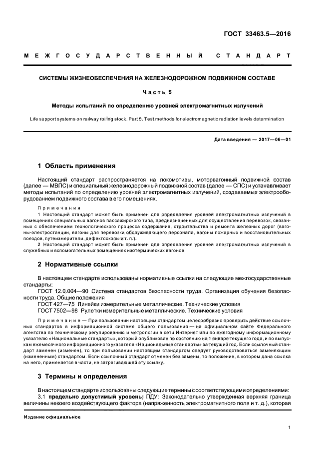 | Область и условия применения: | Настоящий стандарт распространяется на локомотивы, моторвагонный подвижной состав и специальный железнодорожный подвижной состав и устанавливает методы испытаний по определению уровней электромагнитных излучений, создаваемых электрооборудованием подвижного состава в его помещениях |