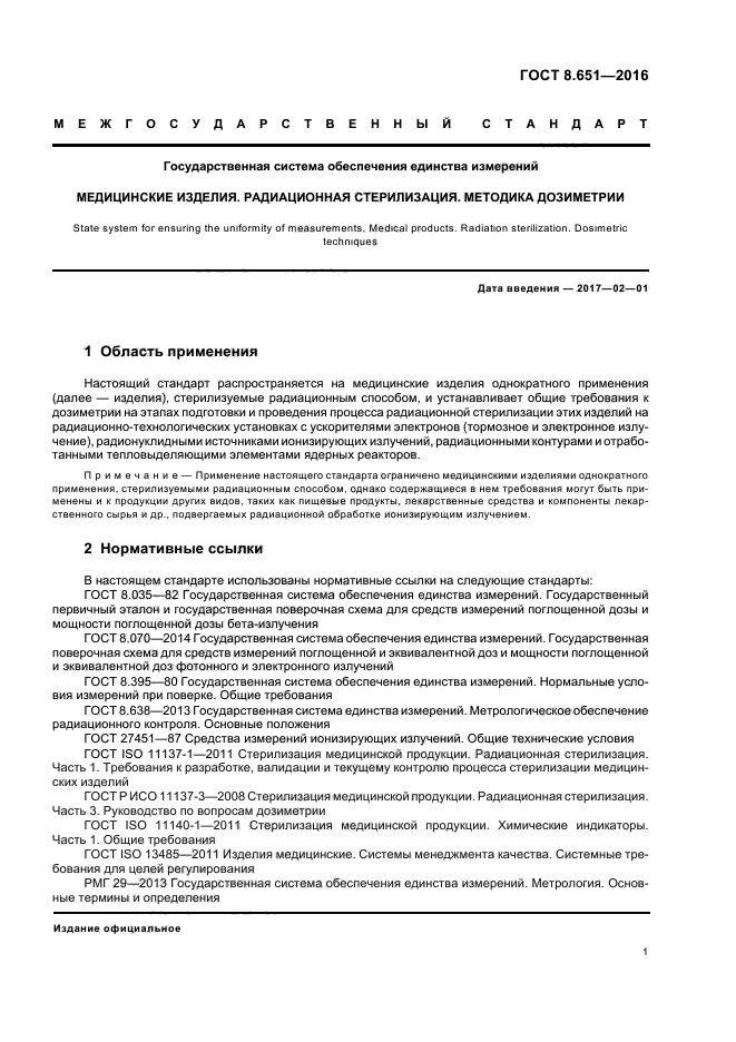 Настоящий стандарт распространяется на медицинские изделия однократного применения, стерилизуемые радиационным способом, и устанавливает общие требования к дозиметрии на этапах подготовки и проведения процесса радиационной стерилизации этих изделий на радиационно-технологических установках с ускорителями электронов (тормозное и электронное излучение), радионуклидными источниками ионизирующих излучений, радиационными контурами и отработанными тепловыделяющими элементами ядерных реакторов