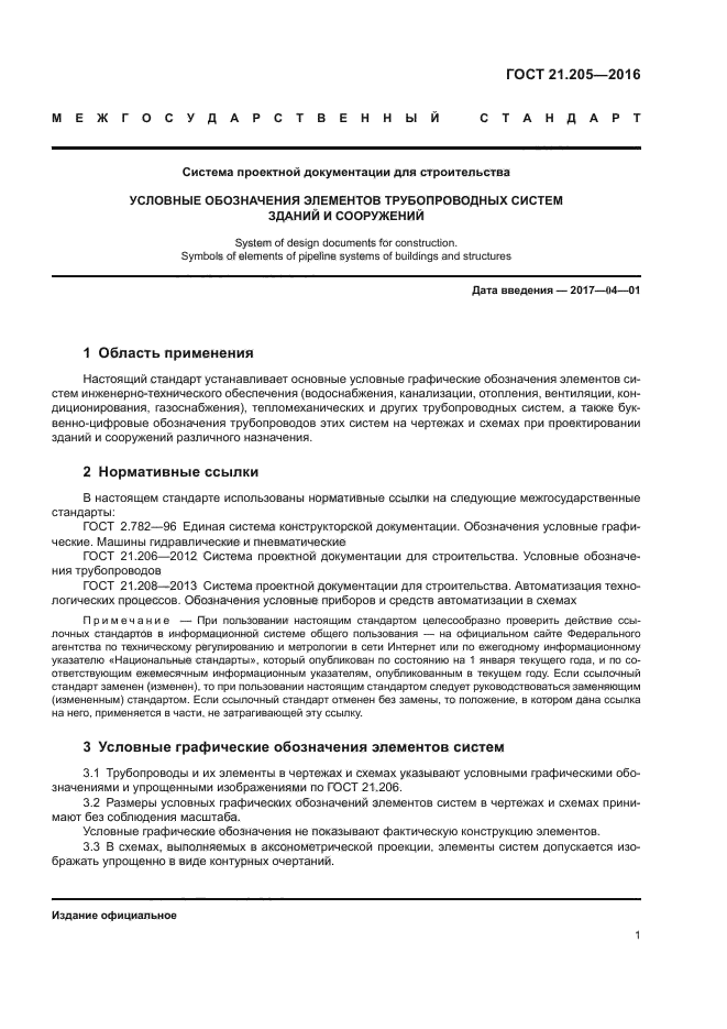 Настоящий стандарт устанавливает основные условные графические обозначения элементов систем инженерно-технического обеспечения (водоснабжения, канализации, отопления, вентиляции, кондиционирования, газоснабжения), тепломеханических и других трубопроводных систем, а также буквенно-цифровые обозначения трубопроводов этих систем на чертежах и схемах при проектировании зданий и сооружений различного назначения