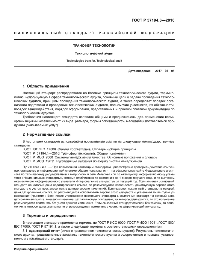 | Область и условия применения: | Настоящий стандарт распределяется на базовые принципы технологического аудита, терминологию, используемую в сфере технологического аудита, основные цели и задачи проведения технологических аудитов, принципы проведения технологического аудита, а также определяет порядок организации подготовки и проведения технологических аудитов, полномочия участников, их обязанности, порядок взаимодействия, порядок оформления, представления и приемки отчетной документации по технологическим аудитам.