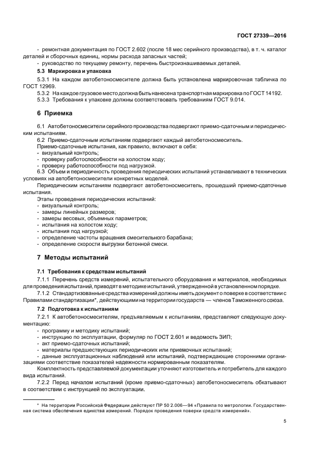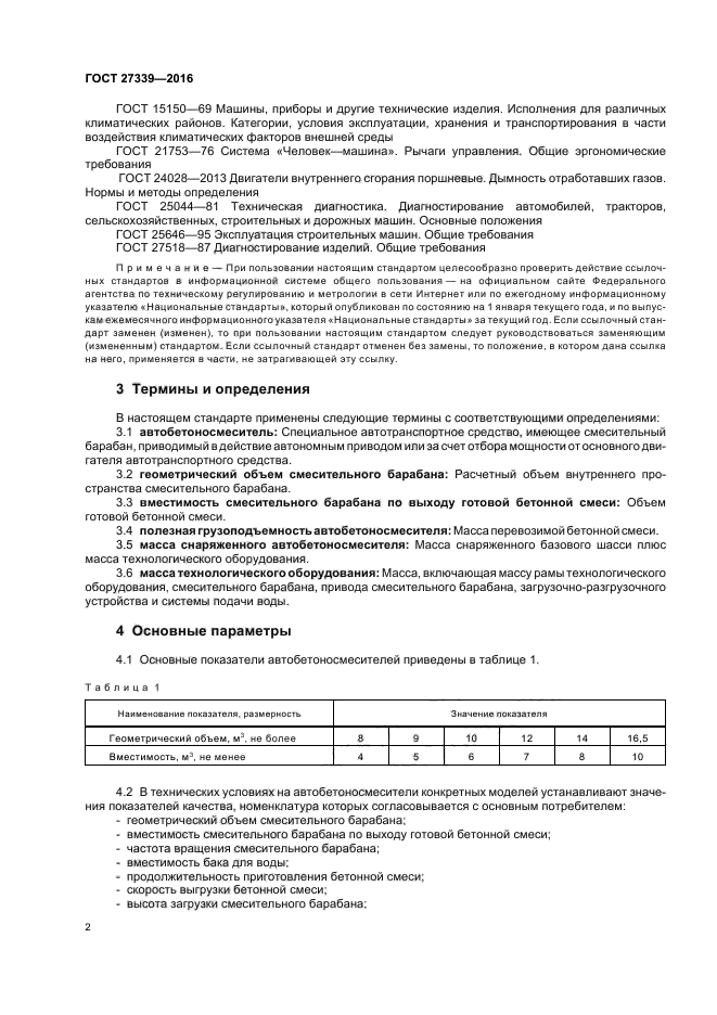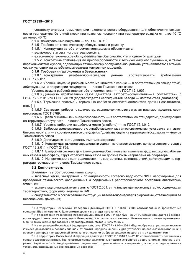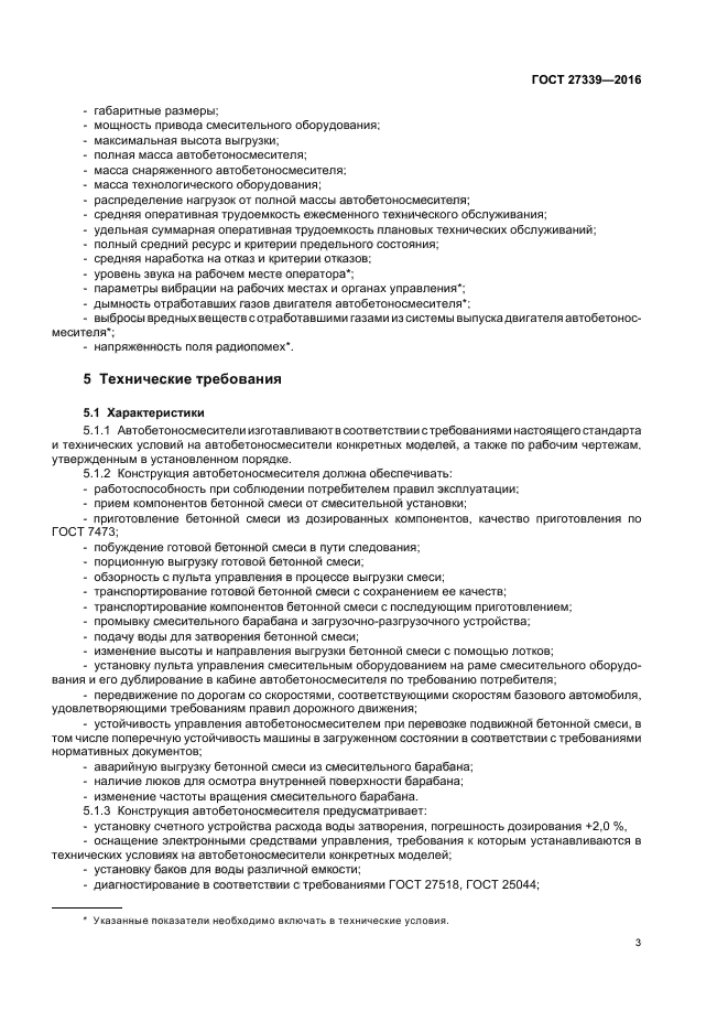 Стандарт не распространяется на автобетоносмесители специального назначения, а также на комбинированные автобетоносмесители с бетононасосами, конвейерами и другим оборудованием. Требования 5.1.2, 5.1.6, 5.3, 7.3.16 являются обязательными, другие требования являются рекомендуемыми. Обязательные требования к автобетоносмесителям, направленные на обеспечение их безопасности для жизни, здоровья оператора и охраны окружающей среды, приведены в 5.1.6, 7.3.16 |