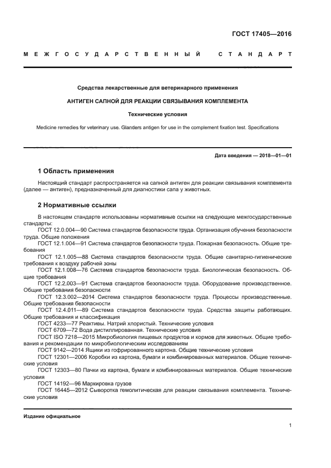 | Область и условия применения: | Настоящий стандарт распространяется на сапной антиген для реакции связывания комплемента, предназначенный для диагностики сапа у животных |