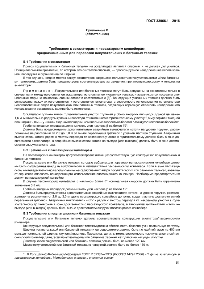 | Область и условия применения: | Настоящий стандарт устанавливает общие требования безопасности к конструкции и установке вновь изготавливаемых эскалаторов и пассажирских конвейеров (пластинчатых или ленточных).